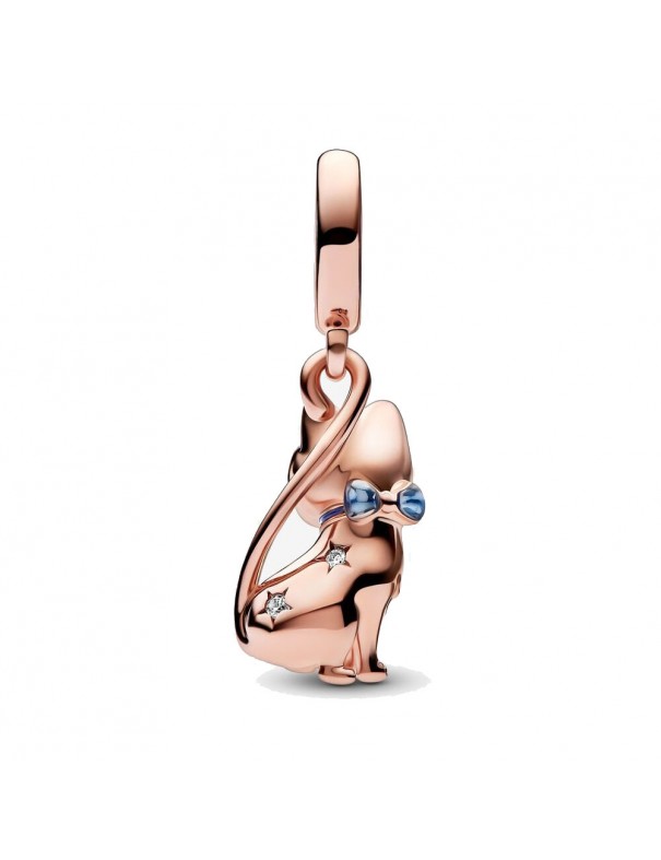 Charm Pandora Colgante Mascota Gato Brillante 782259C01, de metal con recubrimiento electrolítico de oro de segunda ley 14kts. Decorado con circonitas blancas y azules.