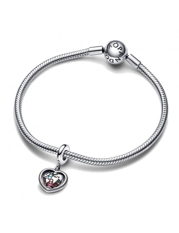 Charm Pandora Colgante Corazón Giratorio Familia 792240C01, en plata de primera ley 925mls, decorado con esmalte de color. Decorado con las grabaciones "My family, my friends, my world".