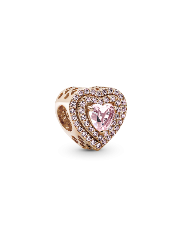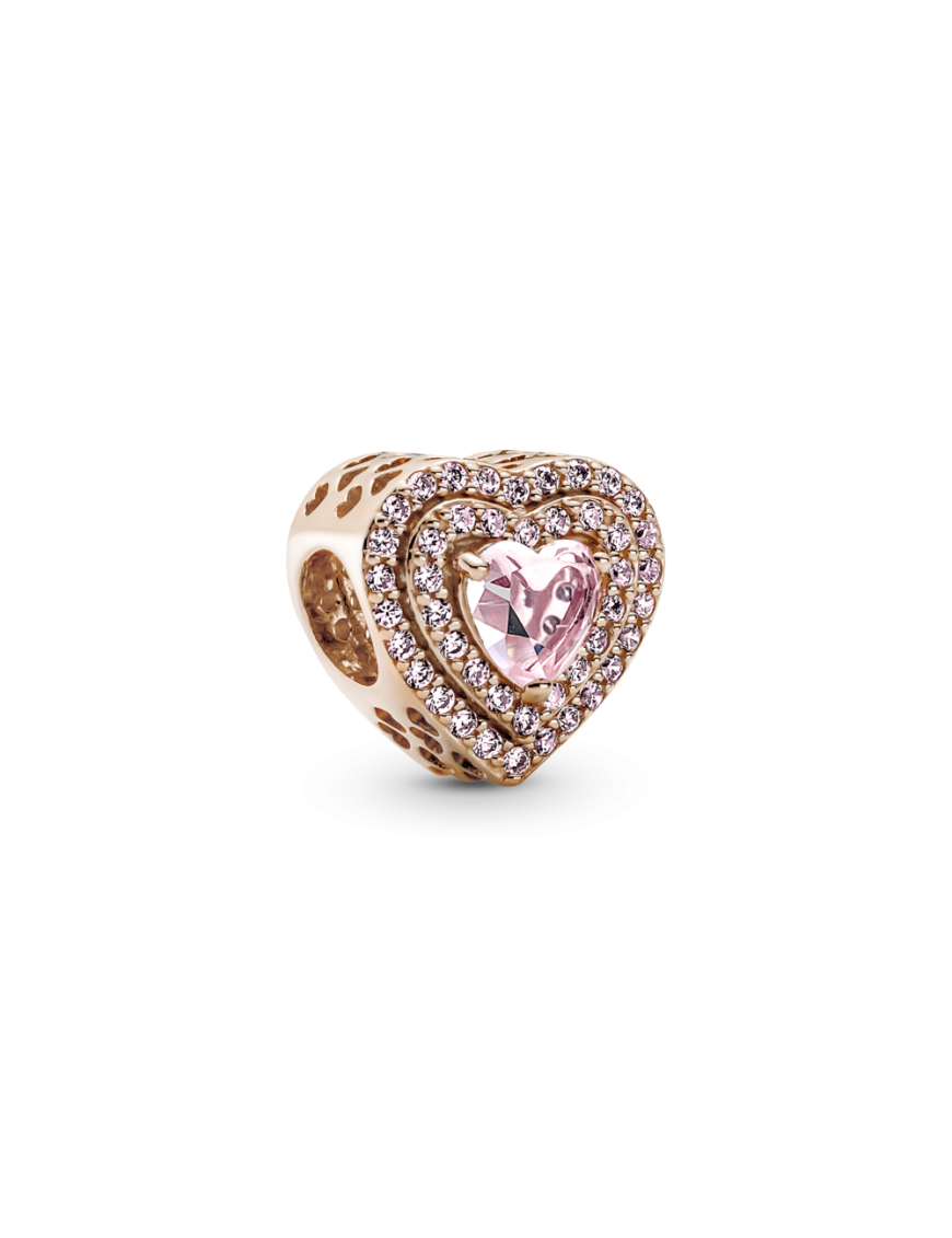 Charm Pandora Corazón Nivelado Brillante 789218C01, en plata de primera ley con recubrimiento electrolítico de oro de segunda ley de 14kts. decorado con cristal rosa y circonitas blancas.