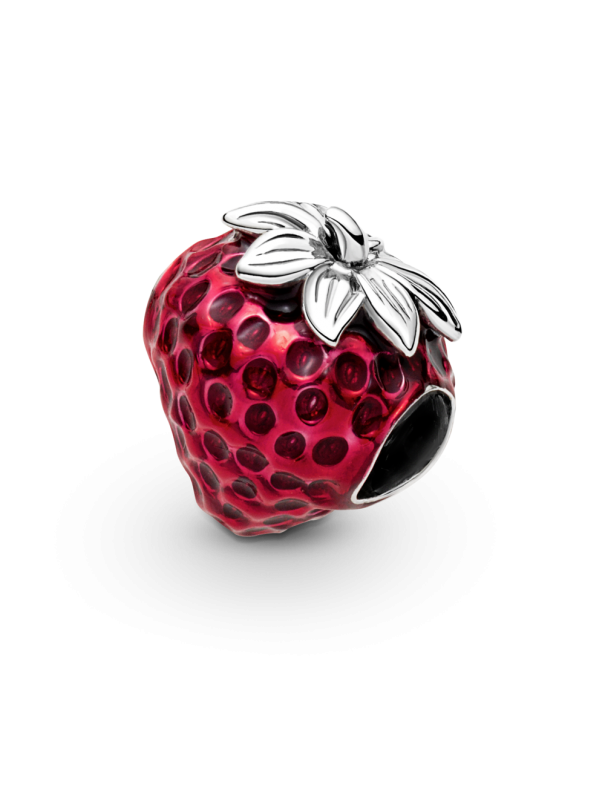Charm Pandora Fresa 791681C01, en plata de primera ley 925mls adornado con esmalte rojo transparente.