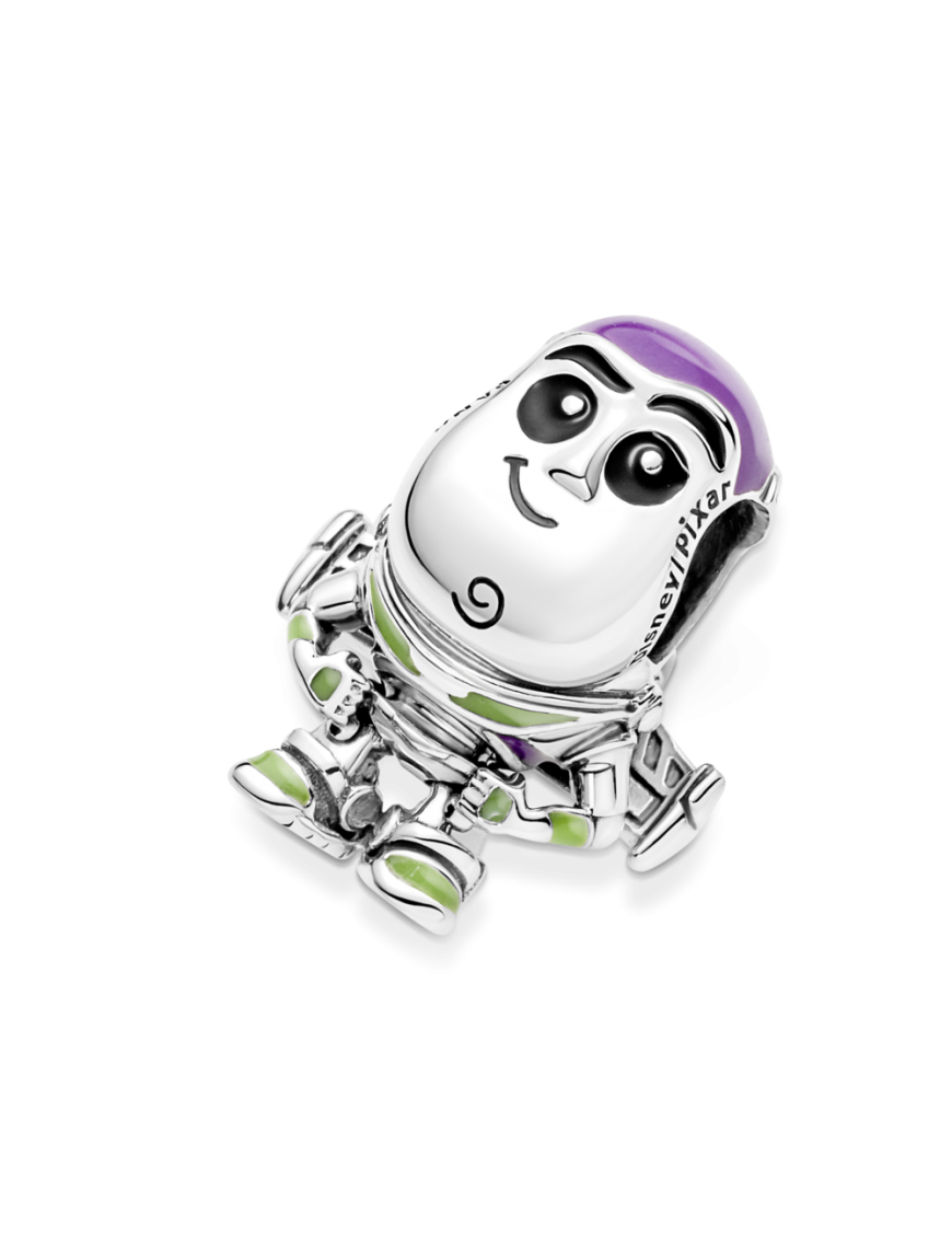 Charm Pandora Buzz Lightyear de Pixar 792024C01, en plata de primera ley 925mls adornado con esmalte lila y verde lima y grabado "ANDY".