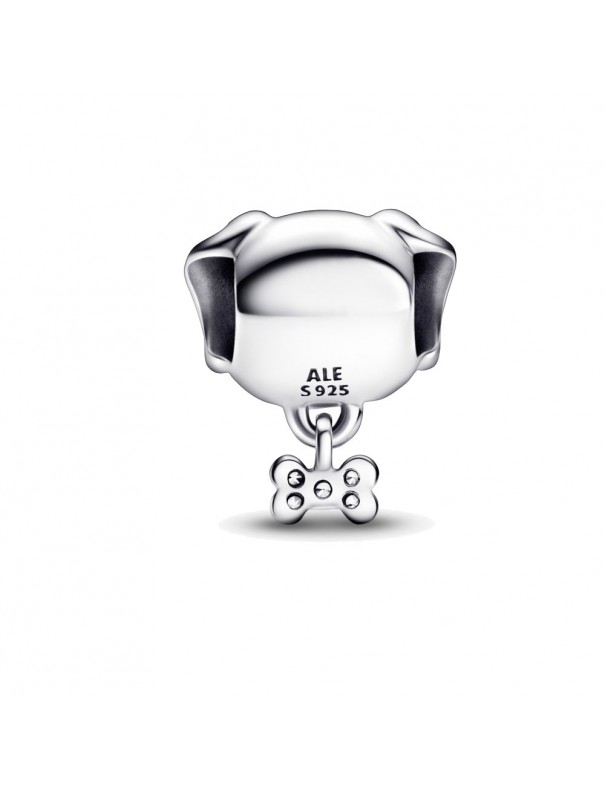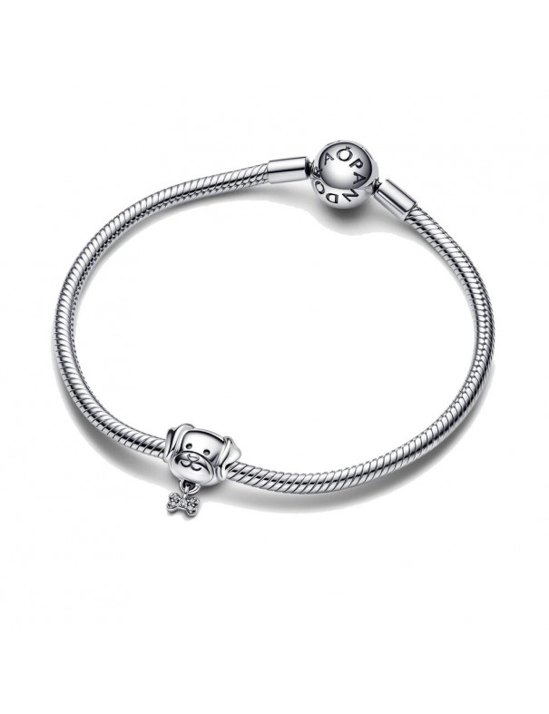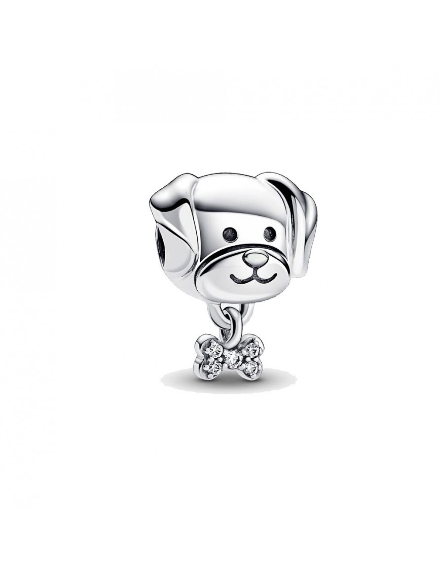 Charm Pandora Mascota Perro y Hueso 792254C01, en plata de primera ley 925mls, decorado con circonitas cúbicas transparentes.
