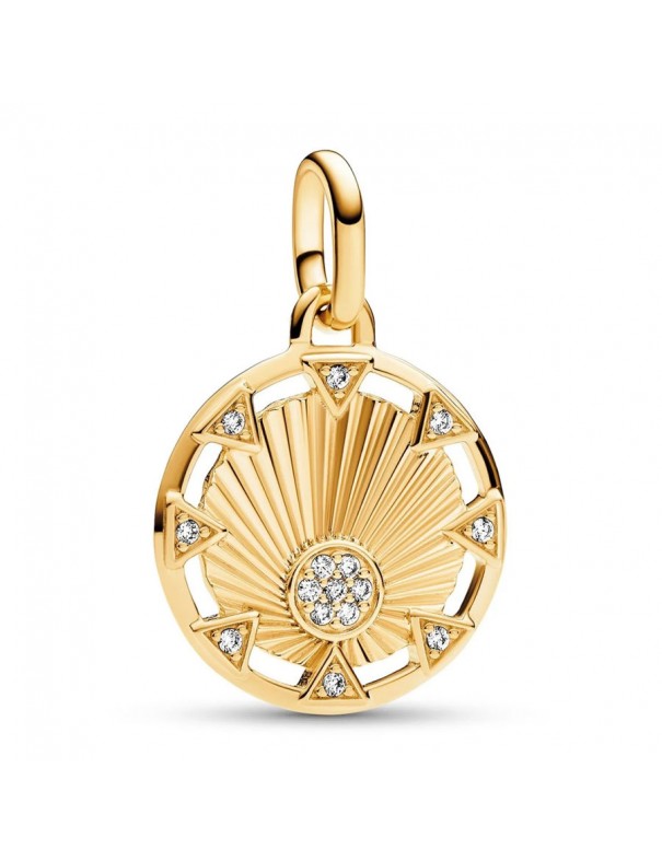 Charm Pandora ME Medallón Poder Luz del Sol 763039C01. Es de una aleación especial de metales bañado en oro amarillo de 14 kts y circonitas. Garantía de tres años.