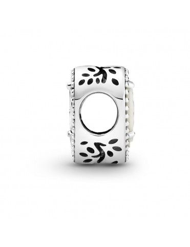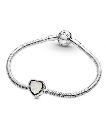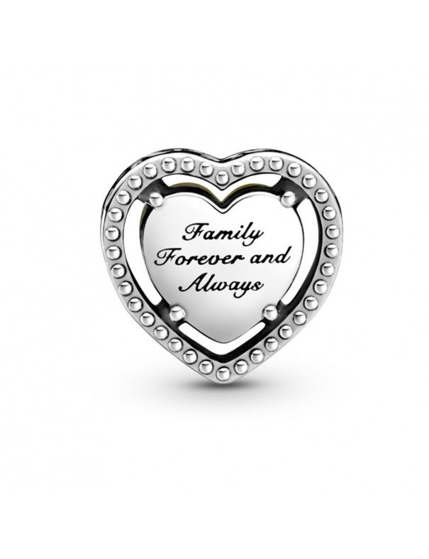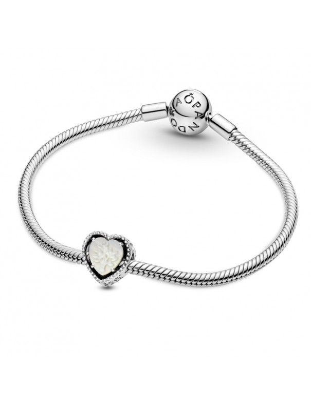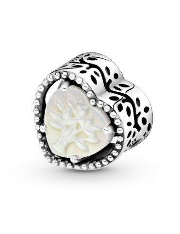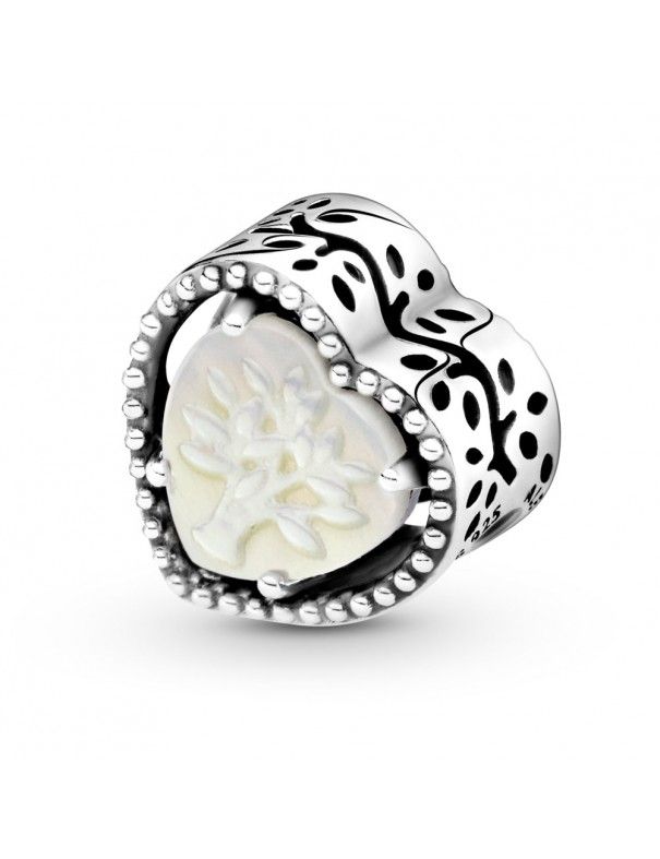 Charm Pandora Corazón Filigrana Y Árbol De La Familia 799413C01, en plata de primera ley 925mls y nácar blanco. Grabación "Family forever and always".