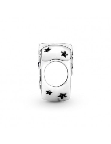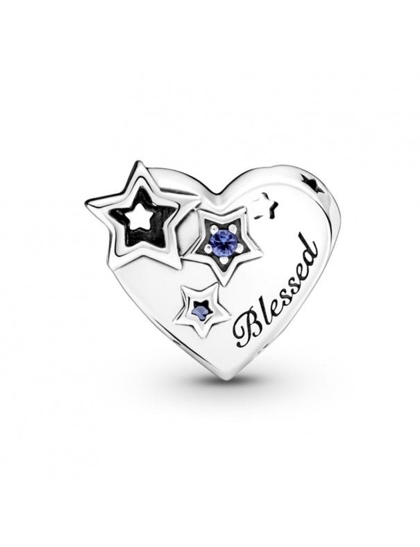 Charm Pandora Corazón Agradecido Y Estrellas 799527C01, en plata de primera ley 925mls, decorado con cristal azul estelar y grabado "Thankful" y "Blessed".