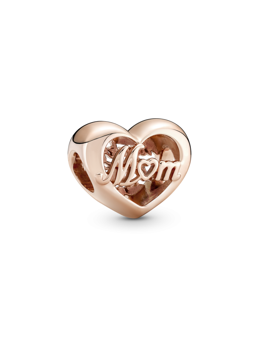 Charm Pandora Corazón Gracias Mamá 781451C00, de metal con recubrimiento electrolítico de oro de segunda ley de 14kts. Grabación "Mom" "Thank you for being here".
