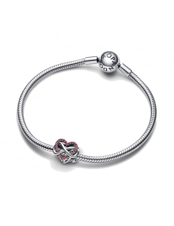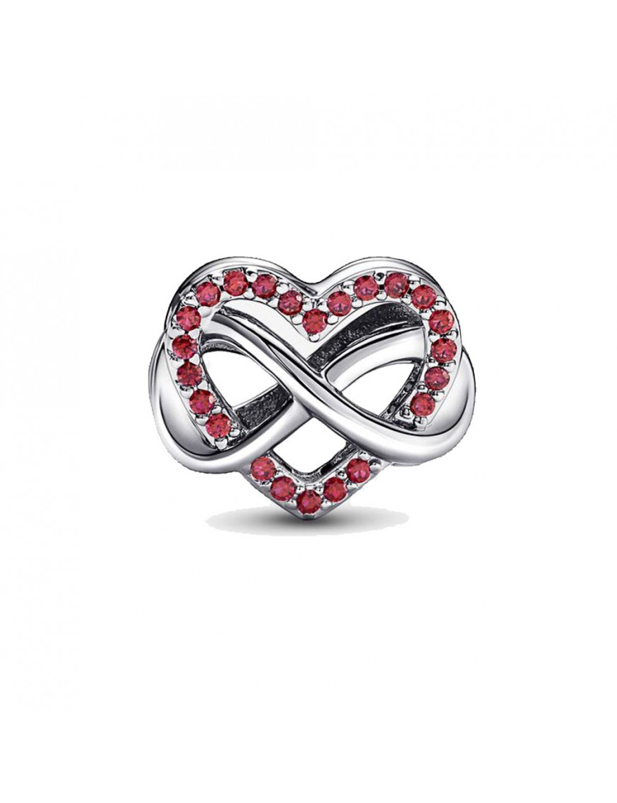 Charm Pandora Corazón Rojo Familia Infinito 792246C01, en plata de primera ley 925mls, decorado con circonitas cúbicas rojas.