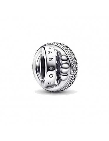 Charm Pandora Signature Logo Pavé y Cuentas 792317C01, en plata de primera ley 925mls, decorado con circonitas cúbicas transparentes.