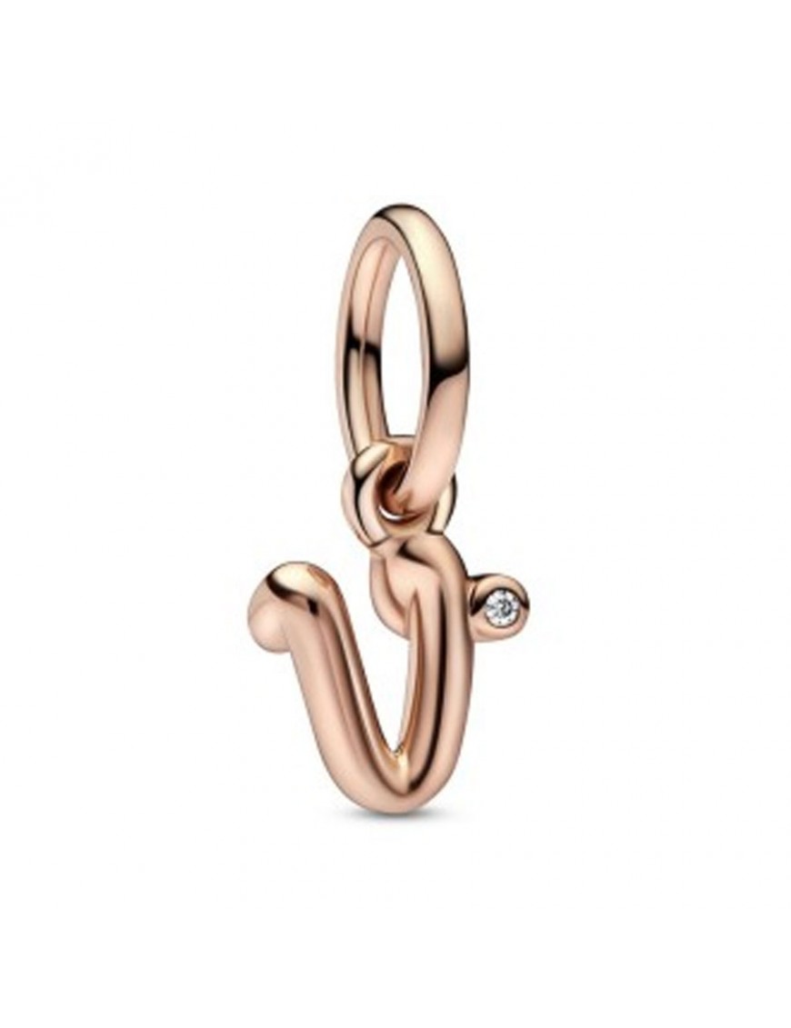 Charm Colgante Letra Minúscula v del Alfabeto 782480C01. Está fabricado en una aleación especial de metales con baño de oro rosa de 14 kts y con circonita. Compatible con Pandora Moments.