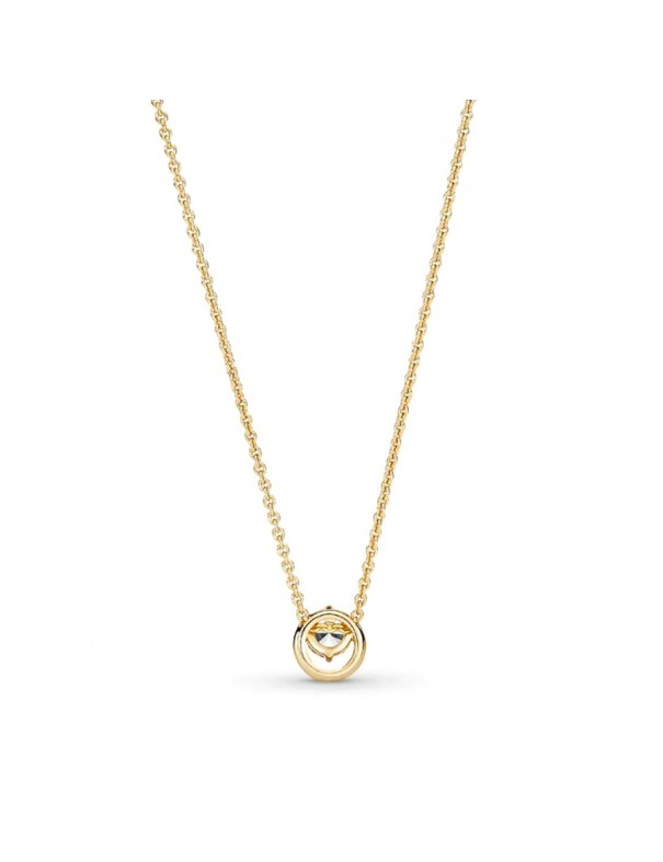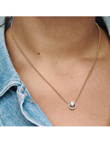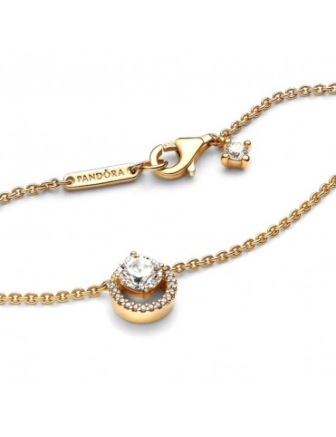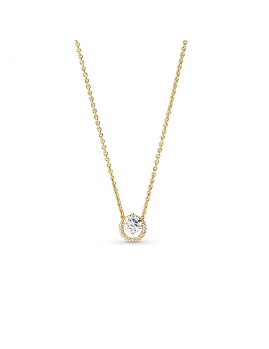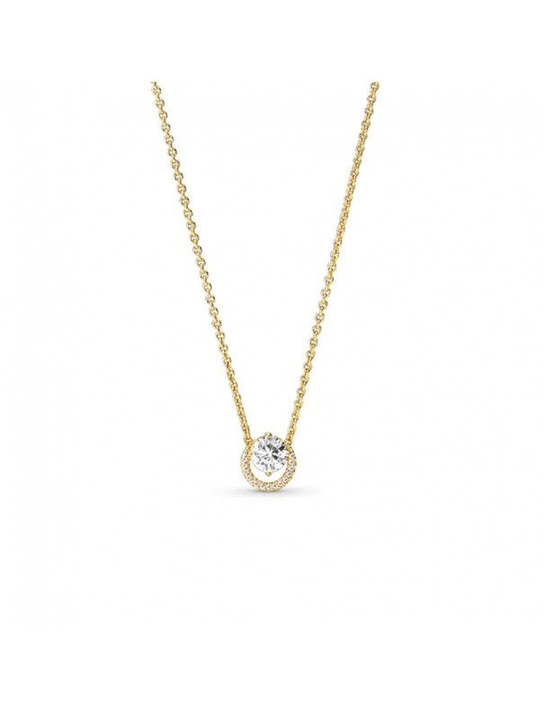 Collar Pandora Colgante Halo Redondo Brillante 361174C01-45. Fabricado en una aleación metálica chapada en oro de 14 k. Este collar de tono dorado presenta una cadena ajustable de 45 cm que lleva un colgante circular adornado con circonitas cúbicas blancas, con una piedra central desplazada que le da un estilo moderno.