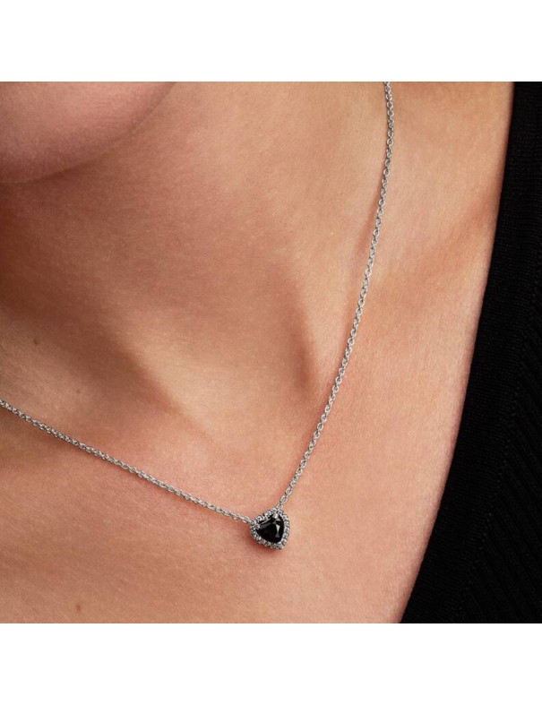 Collar Pandora Corazón en Relieve 398425C03-45. Fabricado en plata de ley, de color plateado con detalles negros. Tiene un colgante central en forma de corazón con un cristal negro y rodeado por un pavé de circonitas cúbicas blancas, diseño elegante, moderno y llamativo.