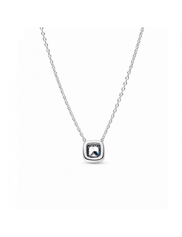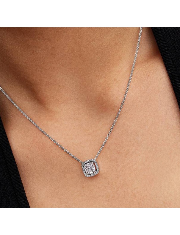 Collar Pandora Halo 393560C02-45. Fabricado en plata de ley 925 con acabado plateado y cadena de 45 cm ajustable con cierre de mosquetón. El colgante central tiene una piedra cúbica de circonita blanca de forma cuadrada, rodeada por un halo de pequeñas circonitas para un brillo uniforme.