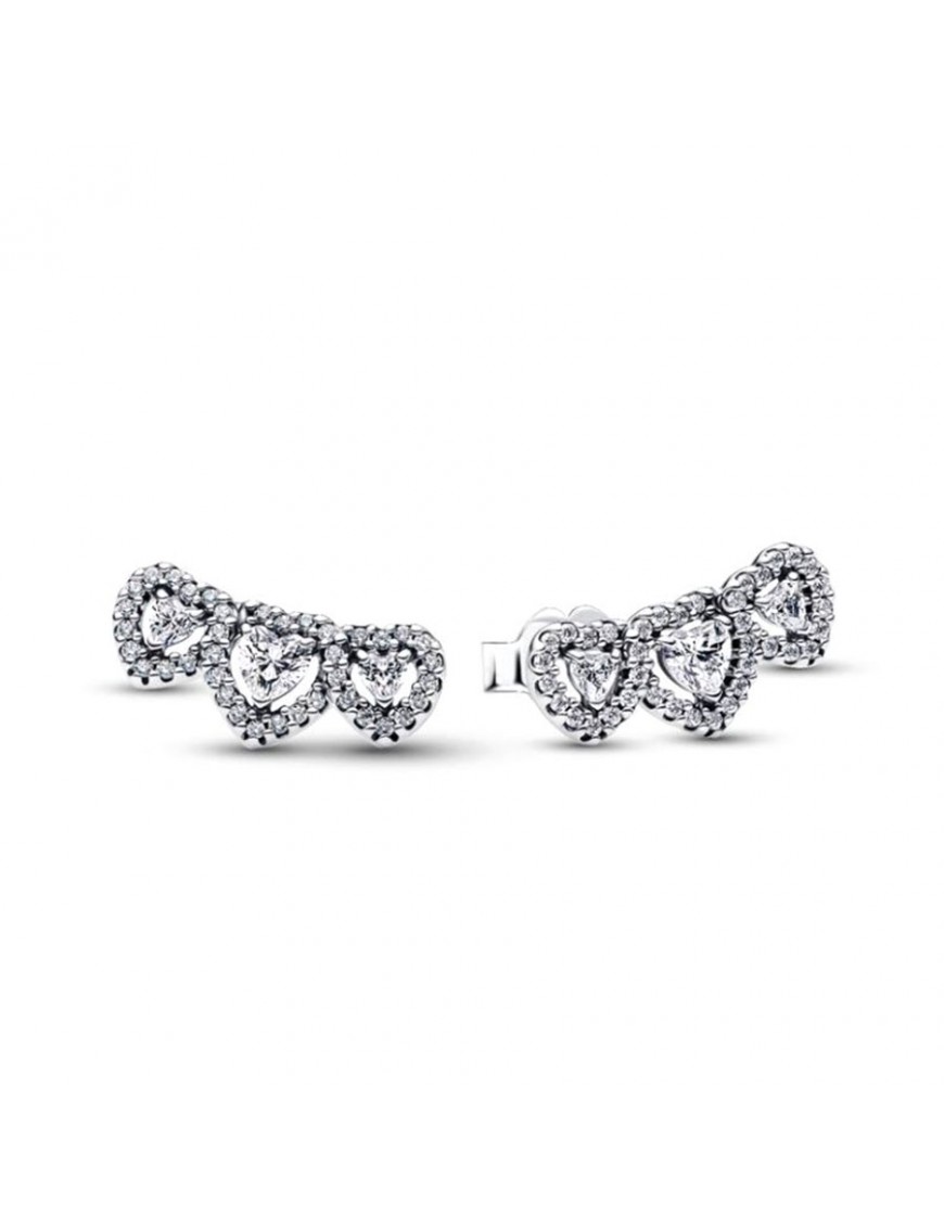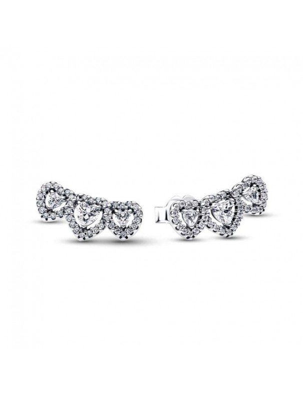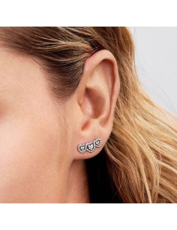Pendientes Pandora de Botón Triple Halo Corazón 294411C01. Pendientes de botón con tres corazones enlazados en plata de ley y engastados con circonitas cúbicas transparentes formando un motivo “halo” que aporta brillo. Tienen cierre de presión seguro, forma delicada de corazones alineados y un estilo elegante.