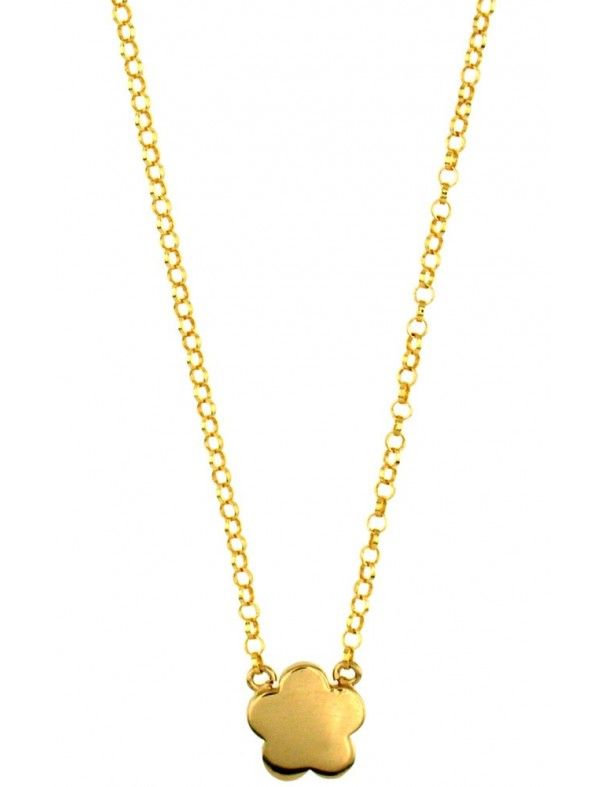 Collar Plata Flor niña 023205-2-1. Se trata de un collar realizado en plata de ley, 925mls, bañado en dorado, para niña. De la cadena cuelga na flor de 5 pétalos que mide 8mm. La longitud del collar es de 40cm y cuenta con 2 años de garantía.