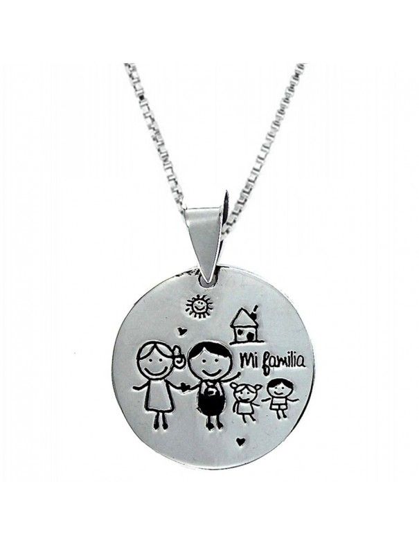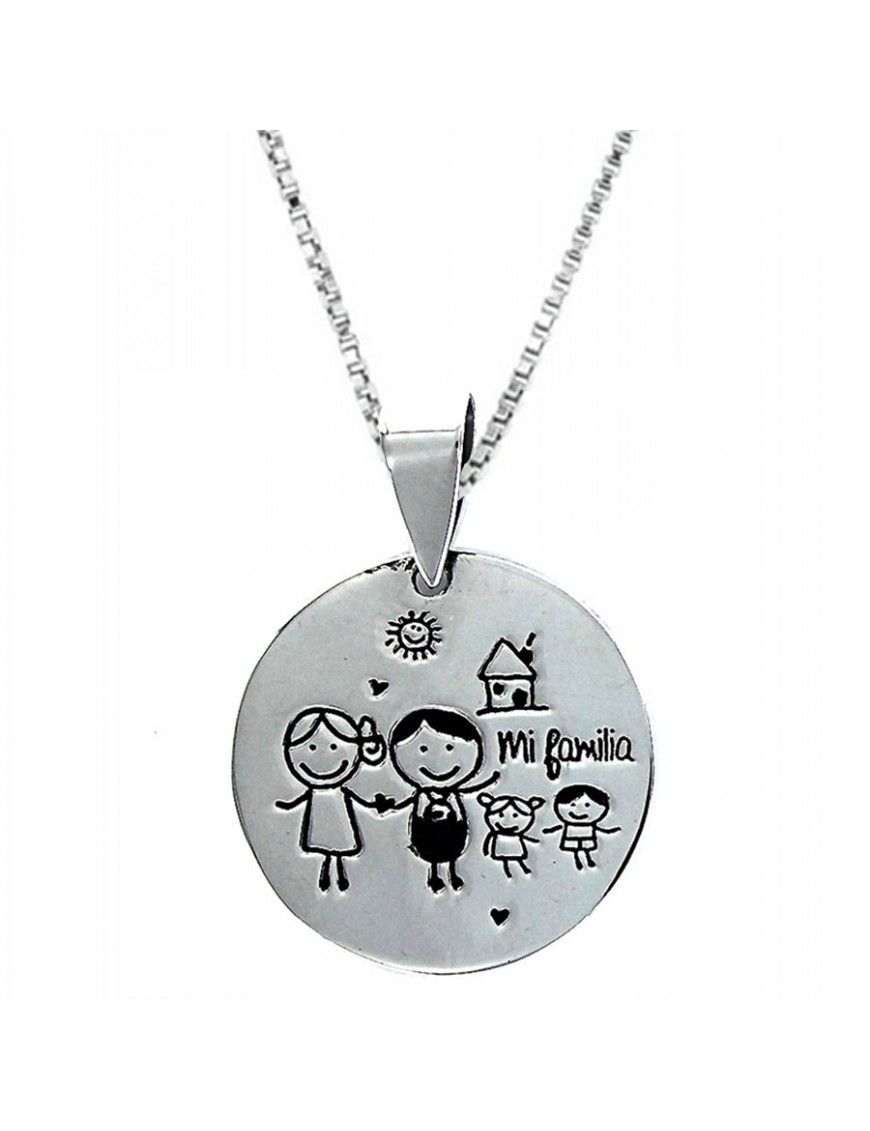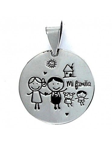 Collar Plata Mujer 9087120. Se trata de un colgante en plata de ley, 925mls, para mujer. Está grabado por un lado con el dibujo de una familia. Tiene forma de disco y mide 25.00mm. Viene con una cadena veneciana de 45.00cm.