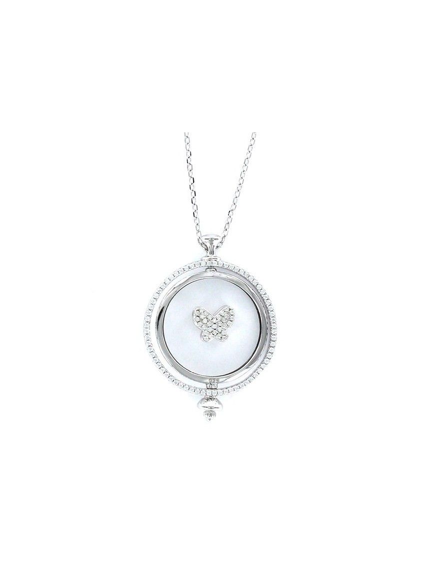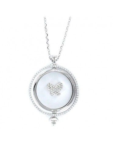 Collar Plata Mujer Doble disco mariposa 9101673. Es un collar elaborado en plata de ley, 925mls, para mujer. El colgante tiene forma circular con una mariposa central que mide 26 milímetros. La mariposa está decorado con circonitas transparentes. La longitud del collar es de 43 centímetros, reducibles a 38 centímetros.