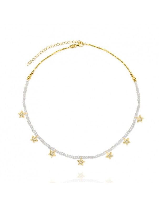 Collar de plata dorada para mujer 175072. Es de plata de primera ley con baño dorado, perlitas y circonitas. Mide 34 cm más ampliación de 7 cm para ajuste.
