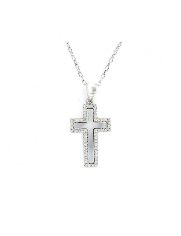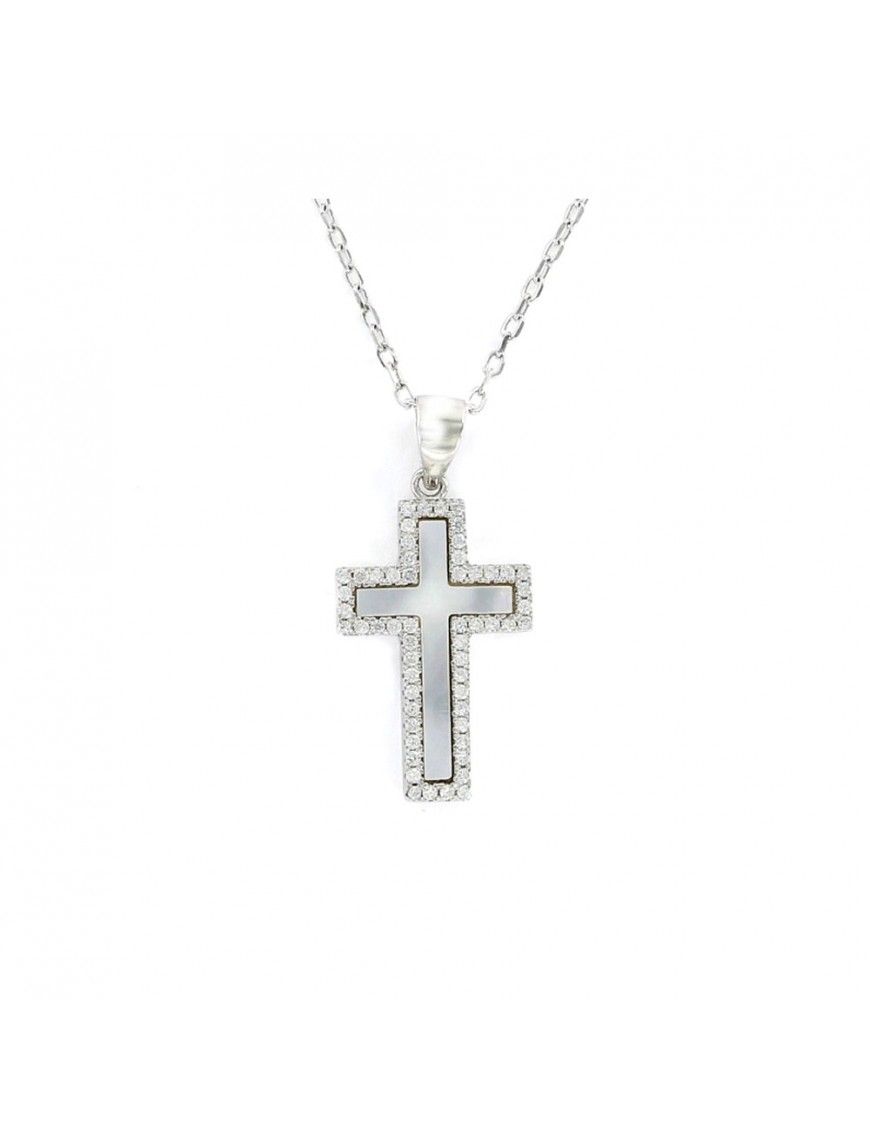 Collar De Plata Cruz Nácar 9105730, fabricado en plata de primera ley y baño de rodio. Crucifico decorado con nácar y circonitas. Cadena ajustable a 43 y 38cm de largo.
