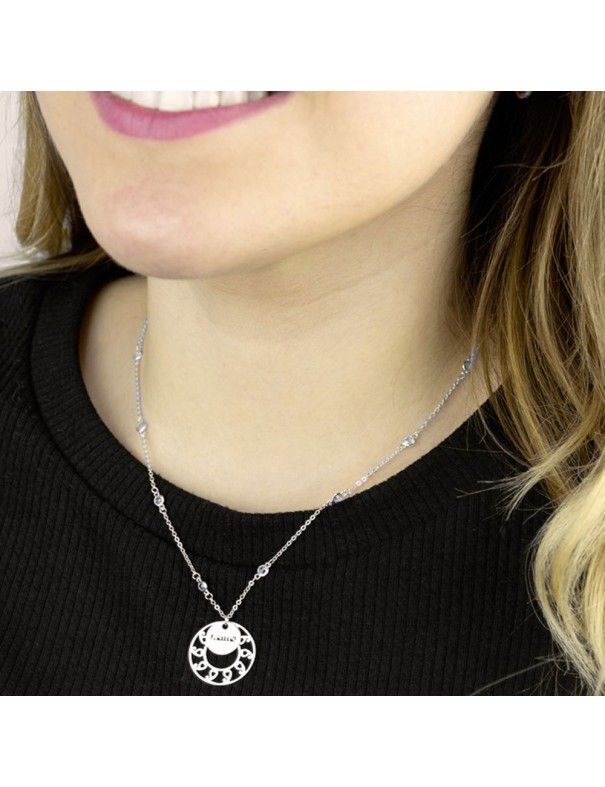 Collar de Plata mamá Círculo 175394, fabricado en plata de primera ley 925mls y baño de rodio. Colgante de 20mm de diámetro, grabación con esmalte negro. Longitud de cadena de 35cm con cadenilla de ajuste 5cm. Circonitas azules. Cierre de mosquetón.