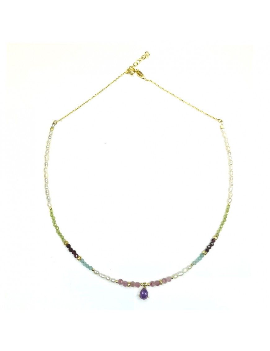 Collar De Plata Chapada Y Piedras Naturales Rio CS001, en plata de primera ley 925mls y baño en oro de 18kts. Piedras naturales de 3mm de diámetro, lágrima morada de 8X6mm, perlas de 2mm. Cadena de 41cm de largo y cadenilla de ajuste de 3cm. Cierre de mosquetón.