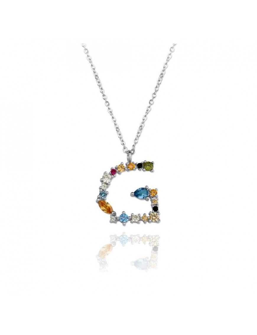 Collar Plata Letra G 175118, en plata de primera ley 925mls y circonitas de colores. cadena de 45cm de largo. Colgante de 7mm. Cierre de mosquetón.