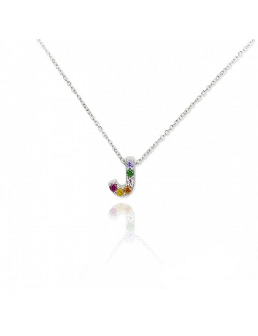 Collar Plata Letra J 175038, en plata de primera ley 925mls y circonitas de colores. Cadena de 41cm con cadenilla de ajuste de 4cm. Colgante de 7mm. Cierre de mosquetón.