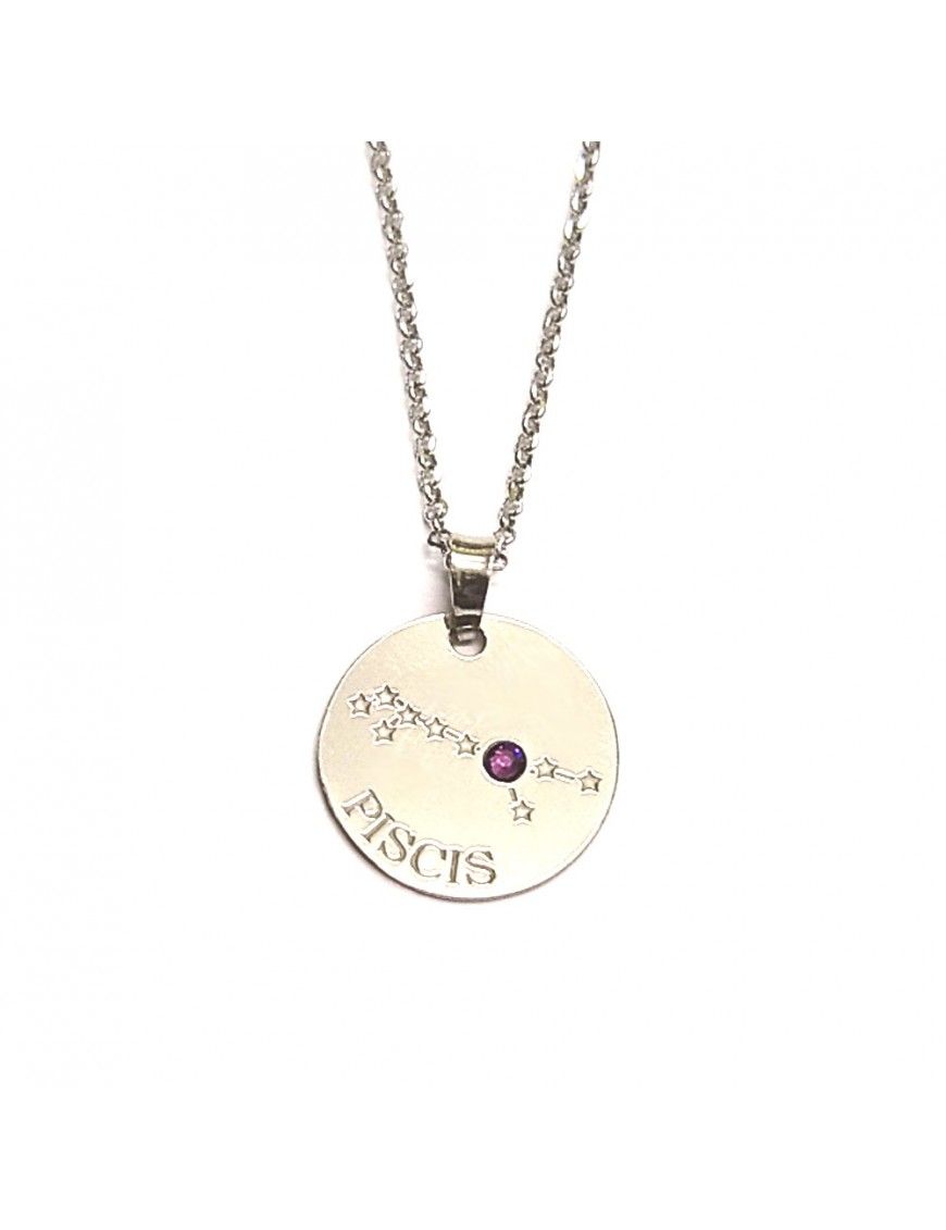 Collar De Plata Horóscopo Piscis 027575-1-1-3, en plata de primera ley 925mls y circonita de color. Chapa de 14mm de diámetro, decorada con grabación de constelación y signo. Cadena de 40cm de largo con cadenilla de ajuste de 3cm. Cierre de mosquetón.