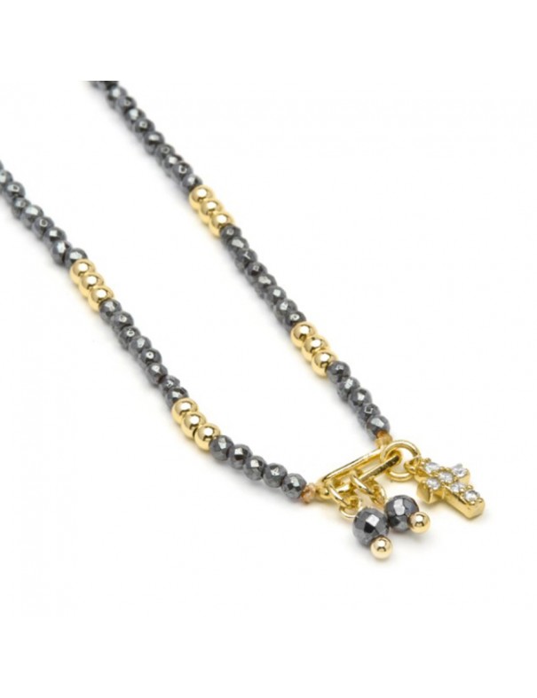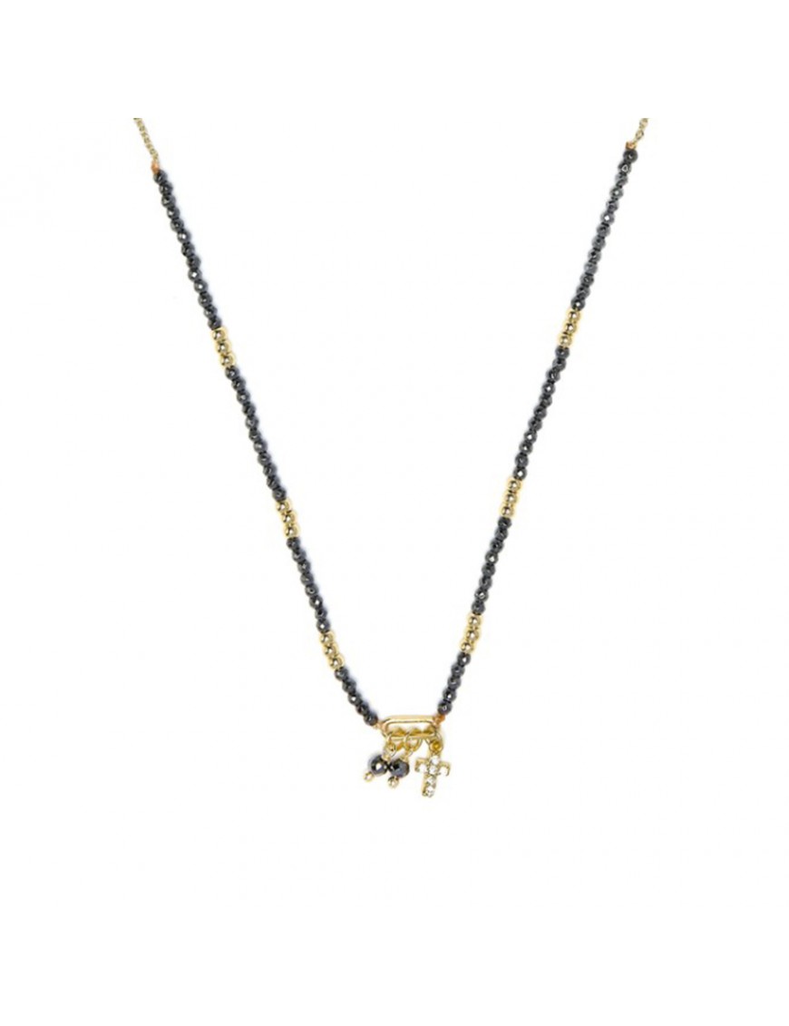 Collar Luxenter Phanvas Plata Piedras NXA141Y0000. Collar elaborado en plata de ley con acabado en oro amarillo de 18 k y circonitas. Contiene piedras en color negro y detalles de color dorado brillante con una cruz con motivo decorativo. Su longitud es ajustable para adaptarse cómodamente al cuello y cuenta con cierre de mosquetón.