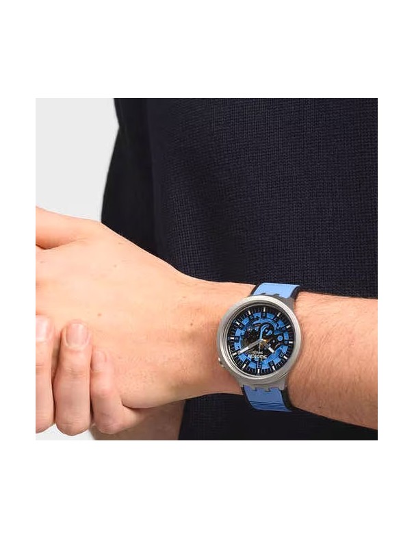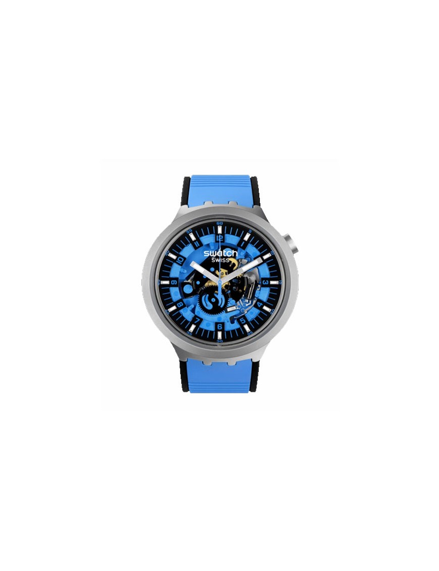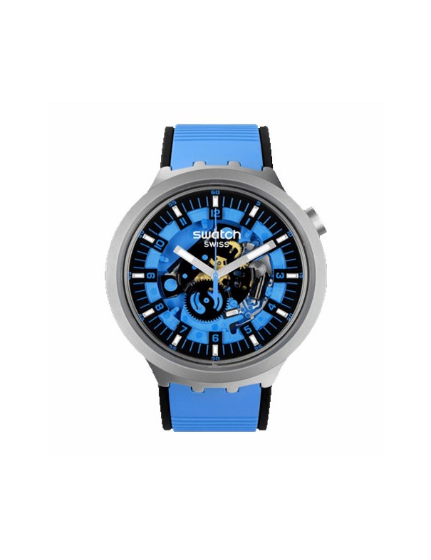 Reloj Swatch Blue Daze SB07S106, analógico de tres agujas. Caja de 47mm de diámetro de acero inoxidable. Pulsera de caucho y cierre de acero. Agujas e indicadores luminiscentes. Sumergible a 3 ATM, por lo que sólo soporta pequeñas salpicaduras.