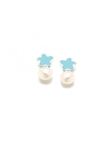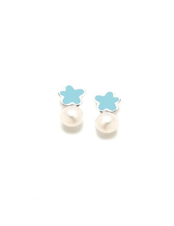 Pendientes Agatha Ruiz Plata Leonor 004LEO, plata de primera ley 925mls rodiados con perla cultivada y nubes de plata en esmalte azul. Cierre de presión.