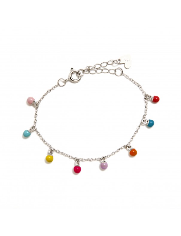 Pulsera Agatha Ruiz Plata 305DIP, en plata de primera ley 925msl y esmalte de colores. Longitud de 14 cm y cadenilla de ajuste de 4cm. Cierre de mosquetón.