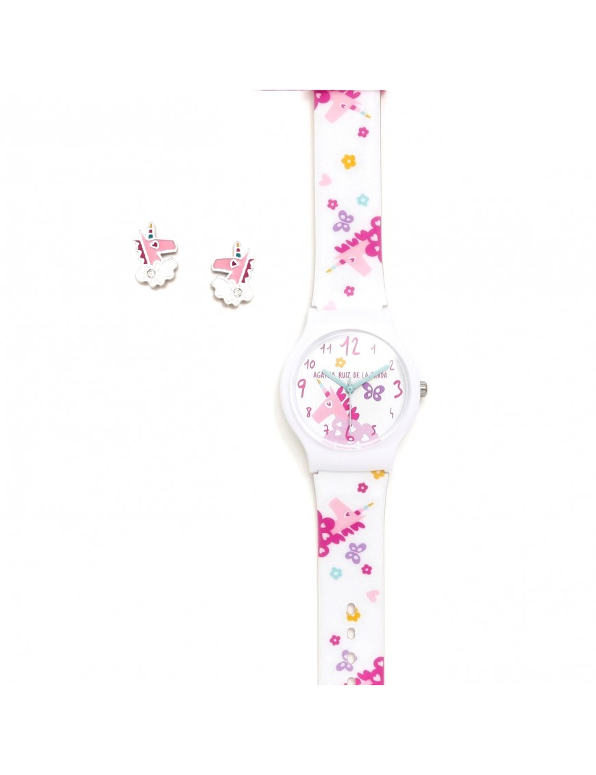 Pack Agatha Ruiz Plata AGR316K, compuesto por reloj analógico de 42mm de diámetro. Caja de plástico y pulsera sándwich-band de PVC. Y pendiente de plata de primera ley 925mls decorados con esmalte y cierre de presión.