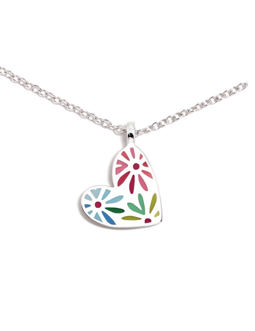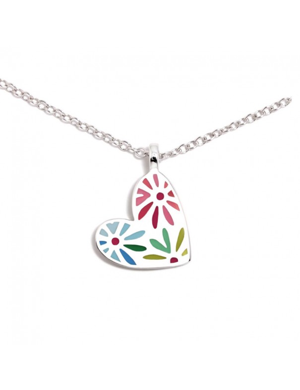 Collar Plata Agatha Ruiz De La Prada 110DAI Daisy para niñas, Es de plata de primera ley 925 mls, el corazon está decorado con flores aplicadas con esmalte. La cadena mide 37 cm más un alargador de 5cm. Tiene tres años de garantía.