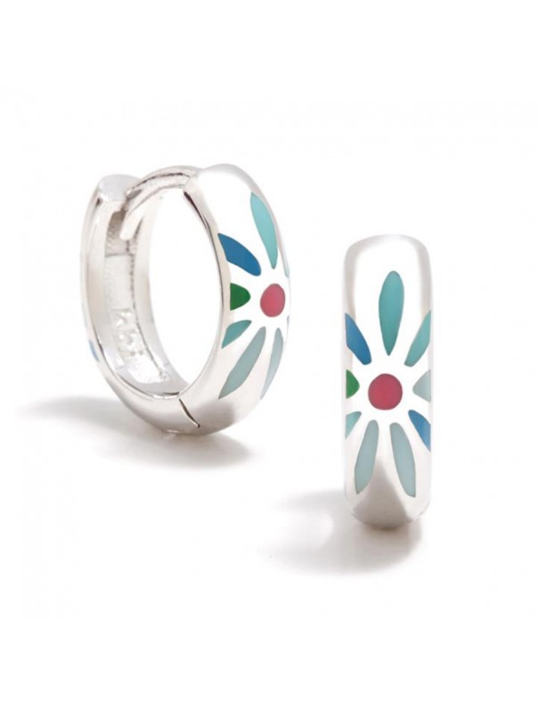 Pendientes Plata Aro Agatha Ruiz De La Prada Daisy 050DAI para niña, están fabricados en plata de ley 925 mls y decorados con una flores aplicadas con esmalte. Miden 12mm de diámetro y tienen cierre de presión. Tiene tres años de garantía.