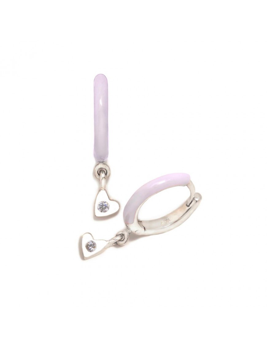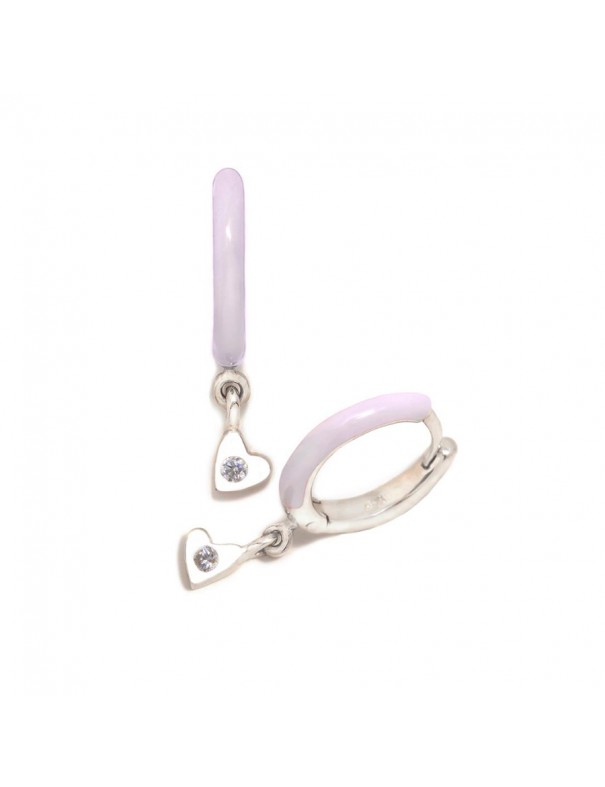 Pendientes Aro Agatha Ruiz de la Prada para niña 034HOP. Son de plata de primera ley de 925 mls con esmalte lila, decorados con un colgante con forma de corazón y una circonita. Miden 10 mm de diámetro. Garantía de tres años.