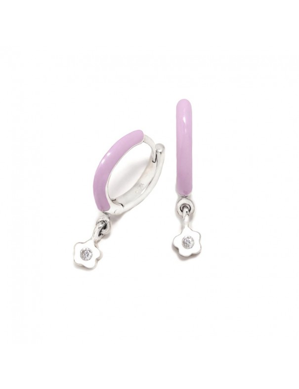 Pendientes Aro Agatha Ruiz de la Prada para niña 035HOP. Son de plata de primera ley de 925 mls con esmalte rosa pastel, decorados con un colgante con forma de flor y una circonita. Miden 10 mm de diámetro. Garantía de tres años.