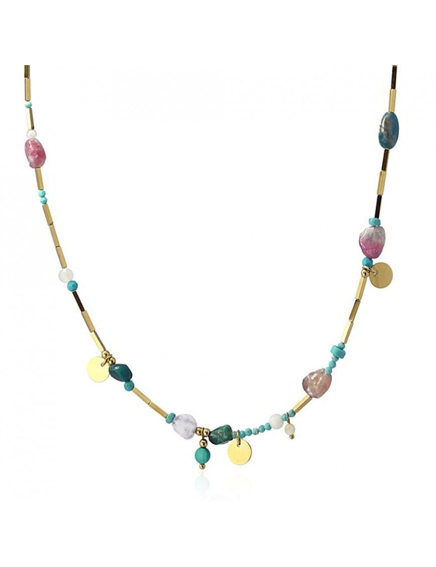 Collar Anartxy Acero Dorado Abalorios BCO043, en acero hipoalergénico bañado en color dorado. Decorado con piedras naturales. Cadena de 40cm y cadenilla de ajuste de 5cm. Cierre de mosquetón.