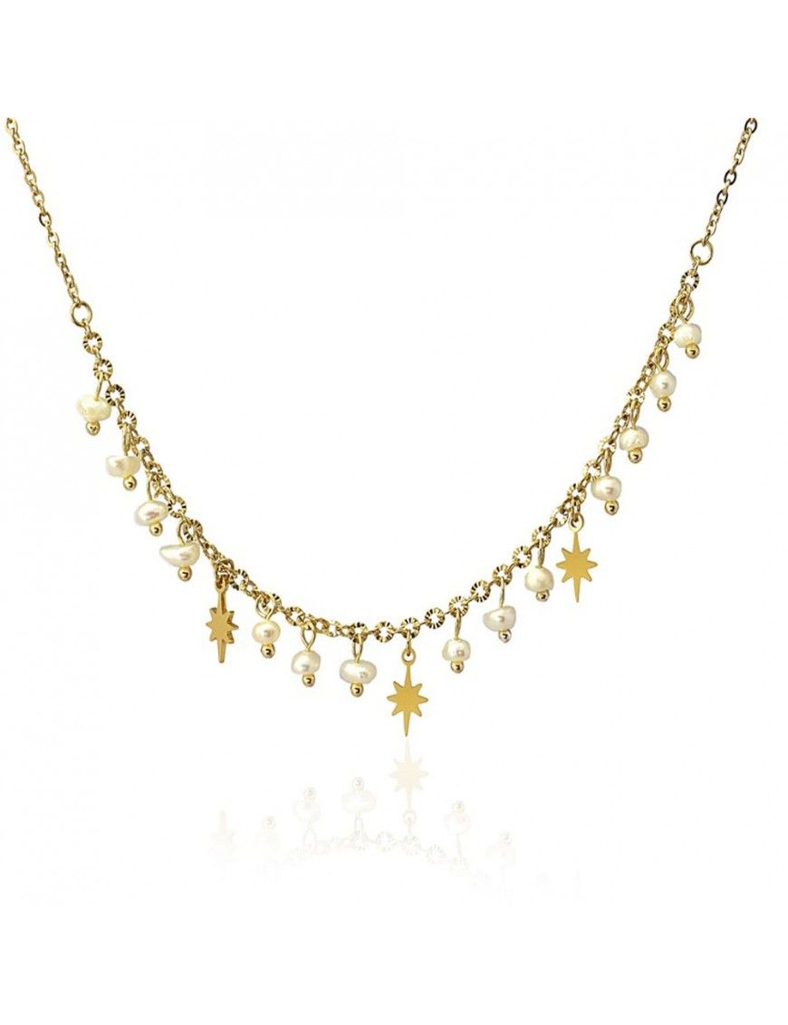 Collar Anartxy Acero Dorado Perlas COA940, en acero hipoalergénico bañado en color dorado y decorado con perlas sintéticas. Cadena de 40cm y cadenilla de ajuste de 5cm. Cierre de mosquetón.