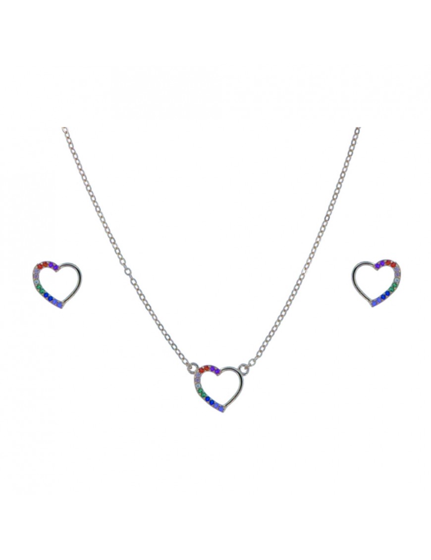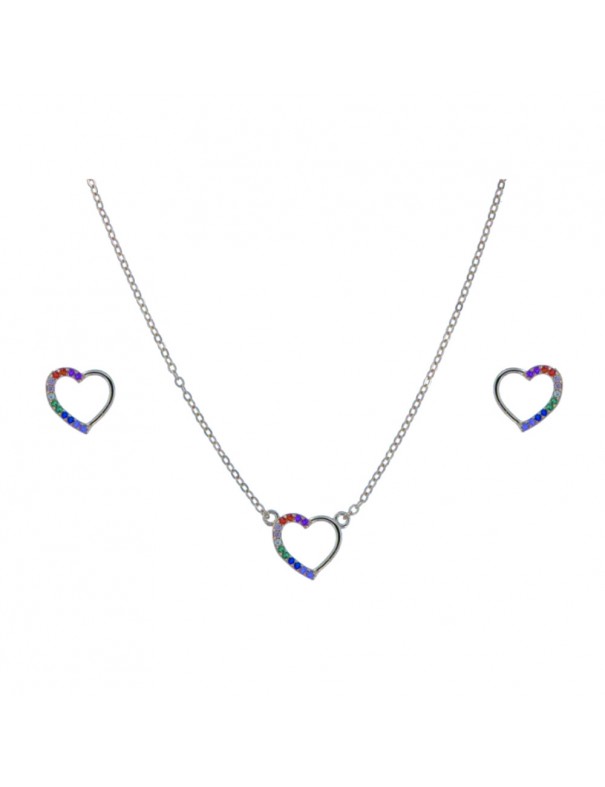 Conjunto Plata Corazón PJUE329 fabricado en plata de Ley 925mls con circonitas de colores. Pendientes con cierre de presión y collar a juego.