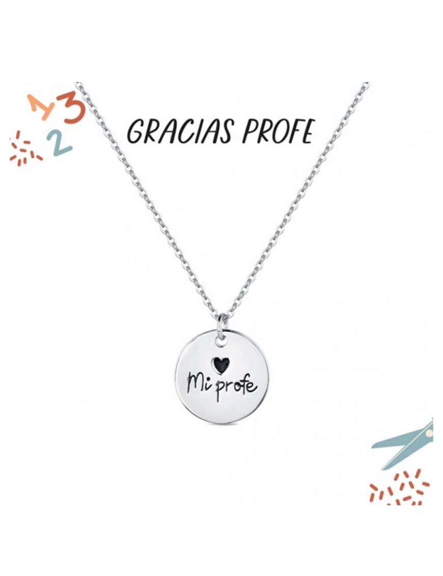 Collar Plata Mi Profe 9120725. Es de plata de primera ley de 925 mls con un baño de rodio. Diseñado con un disco de 18mm de diámetro, lleva inscrito la frase "Mi profe", convirtiéndolo en el regalo perfecto para expresar gratitud y admiración. Acompañamos al colgante con una cadena de 38 cm de longitud más un extensor de 5 cm para un ajuste perfecto. Garantía de tres años.