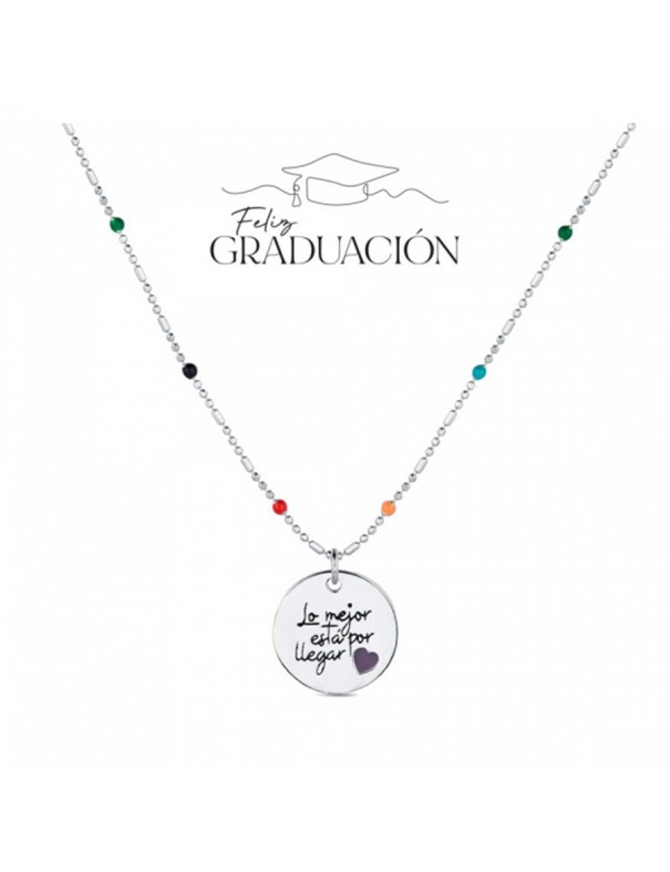 Collar Plata Graduación Lo Mejor Está Por Llegar 9120699. Es de plata de primera ley de 925 mls con un baño de rodio. Lleva un cadena adornada con bolitas multicolor y un disco de 18 mm grabado con el inspirador mensaje "persigue tus sueños", por la parte trasera es liso para poder personalizarlo. La cadena mide 38 cm de largo más 5 cm de extensor.