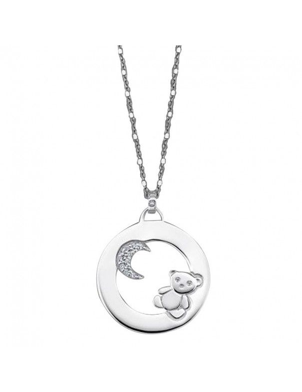 Es un collar Lotus realizado en plata de ley, 925mls, decorado con un colgante circular acompañado de un oso y una luna, adornados con circonitas transparentes.