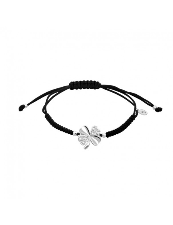 Pulsera Lotus Silver Trébol Plata LP3108-2/2. Fabricada en plata de ley 925 combinada con cordón de nylon negro, con acabado pulido y diseño ajustable mediante cierre deslizante para adaptarse a diferentes muñecas. Presenta un motivo decorativo de trébol de cuatro hojas con circonitas blancas engastadas que aporta un toque de brillo.