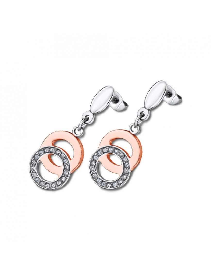 Pendientes Lotus Style Doble Círculo LS1913-4/2, de acero hipoalergénico. Uno de los círculos con baño de color cobrizo y otro con circonitas. Cierre de presión. Garantía de dos años contra defectos de fabricación.