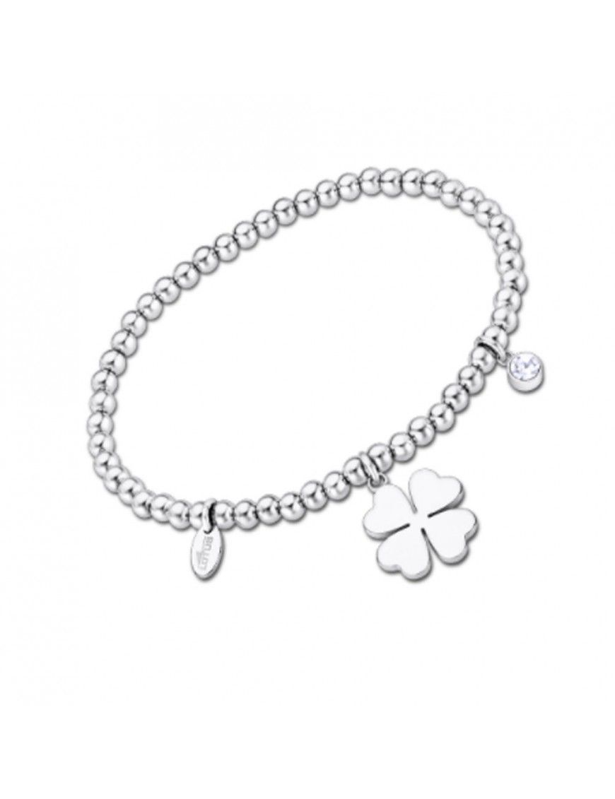 Pulsera Lotus Style Acero Mujer LS2170-2/1, de acero hipoalergénico elástica. Con dos colgantes: circonita y silueta en forma de trébol con cuatro hojas. Cuerpo de la pulsera compuesta por bolitas. Garantía de dos años contra defectos de fabricación.
