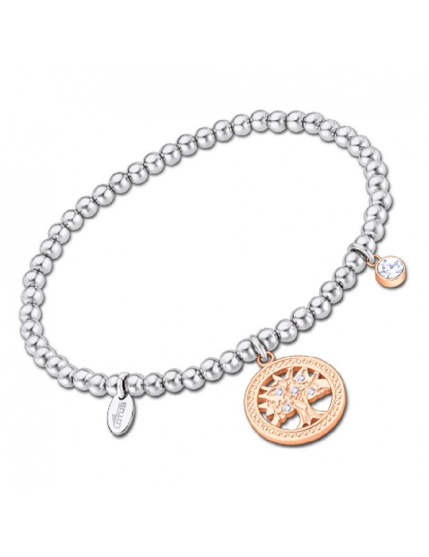 Pulsera Lotus Style Acero Mujer LS2171-2/4, de acero hipoalergénico elástica. Con dos colgantes: circonita y siluesta con forma de Árbol de la Vida en color cobrizo. Cuerpo de la pulsera formado por bolitas de acero. Garantía de dos años contra defectos de fabricación.