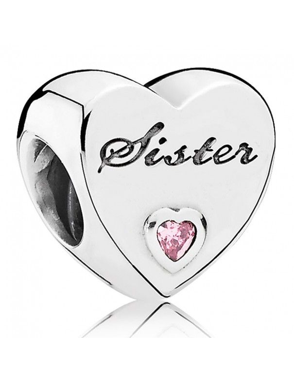 Charm Pandora plata Amor de Hermana 791946PCZ. Es una abalorio original de la firma Pandora, para mujer, hecho en plata de ley, 925mls. Tiene forma de corazón, decorado con una cristal rosa en forma de corazón, y la grabación de la palabra Sister, hermana en castellano. La garantía de este Charm Pandora es de 2 años.