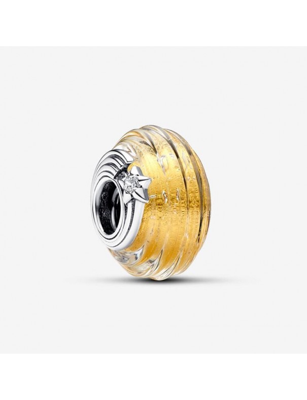 Charm Pandora Cristal de Murano Acanalado Estrella Fugaz 792982C01. Es de plata de primera ley de 925 mls con murano y lámina de oro de 24 kts y circonitas. Garantía de tres años.