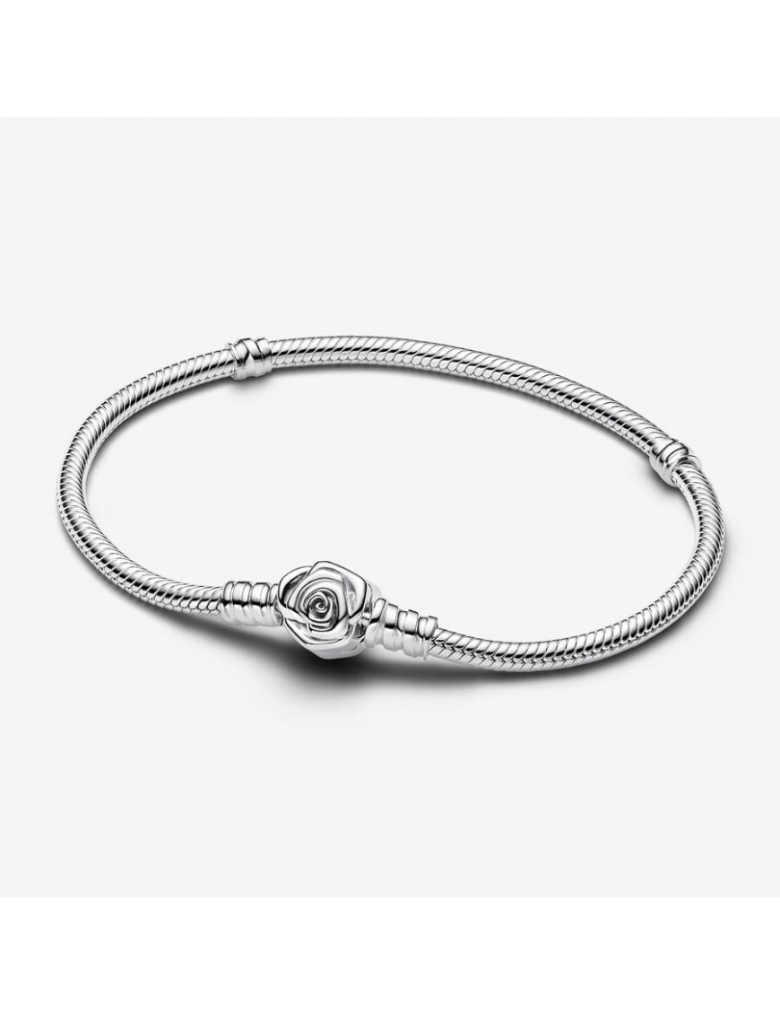 Pulsera Pandora Moments 19 cm Cierre Rosa Floreciendo 593211C00-19. Fabricada en plata de primera ley 925 mls con cadena de serpiente y cierre con forma de rosa. Tiene tres años de garantía.