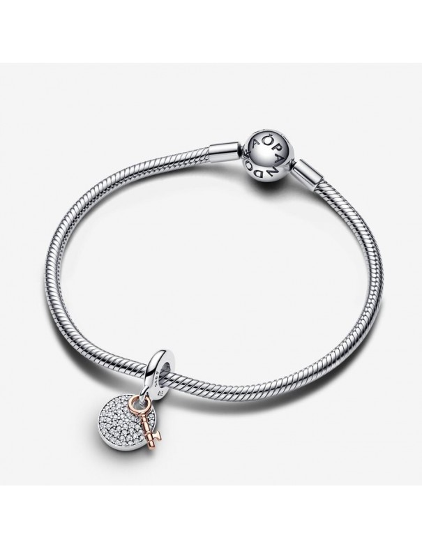 Charm Pandora Colgante Doble Llave a la Felicidad 783236C01 fabricado en plata de ley 925 mls y el colgante de la llave recubierto en oro rosa de 14k, el disco colgante está adornado con circonitas en pavé y por la parte lleva la inscripción "FAMILY is the key of happiness" (la familia es la llave de la felicidad).